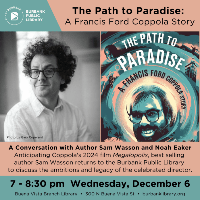 The Burbank Public Library presents The Path to Paradise: A Francis Ford Coppola Story, with a conversation between the author and editor of the recently-released book, on Wednesday, December 6, at the Buena Vista branch of the library.