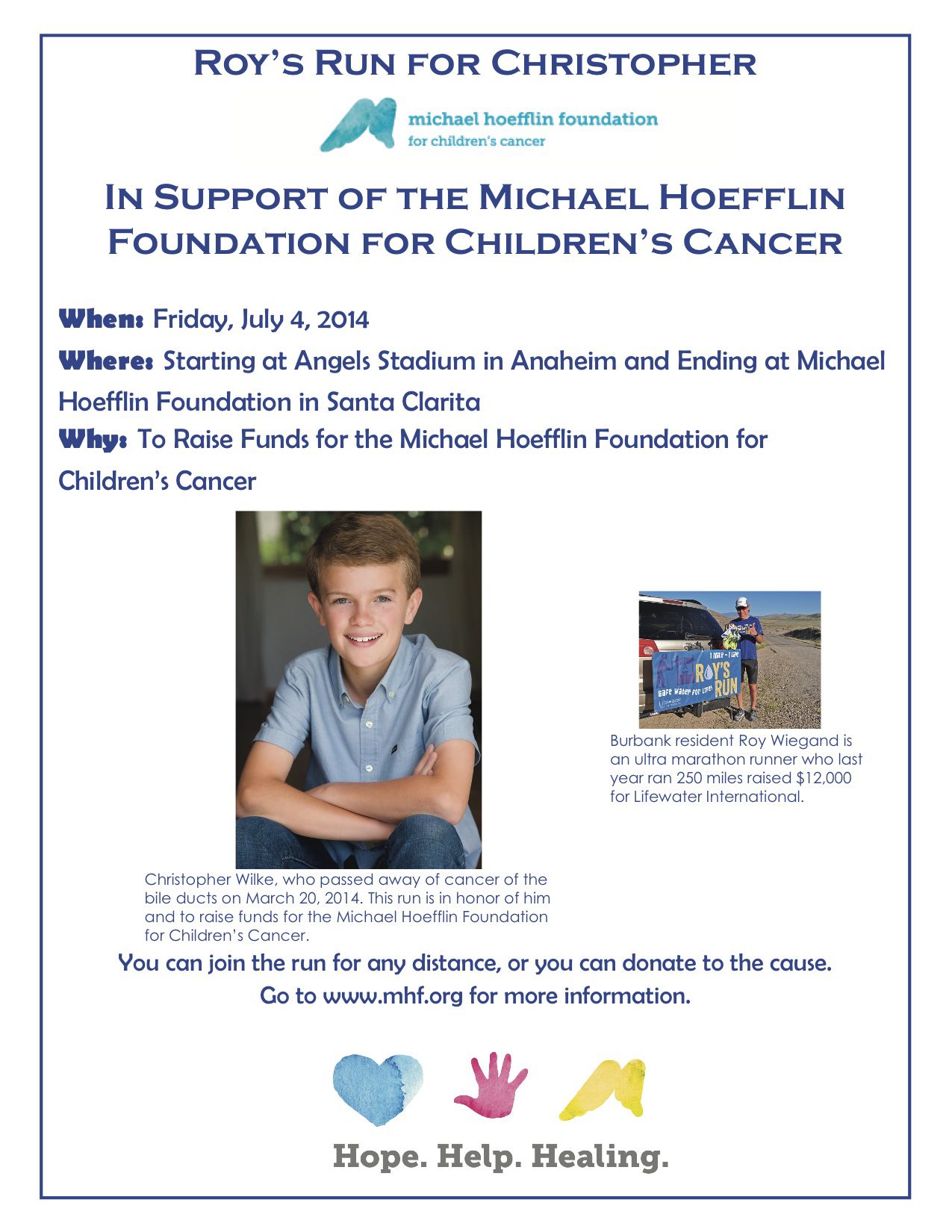 Santa Clarita, CA – In honor of Christopher Wilke, a 12-year-old boy who died of cancer of the bile ducts on March 20, 2014, Burbank resident and ultra marathon runner Roy Wiegand is planning to run from Angels Stadium in Anaheim to the Michael Hoefflin Foundation in Santa Clarita, on Friday, July 4. All proceeds from this run will go to the Michael Hoefflin Foundation for Children’s Cancer.