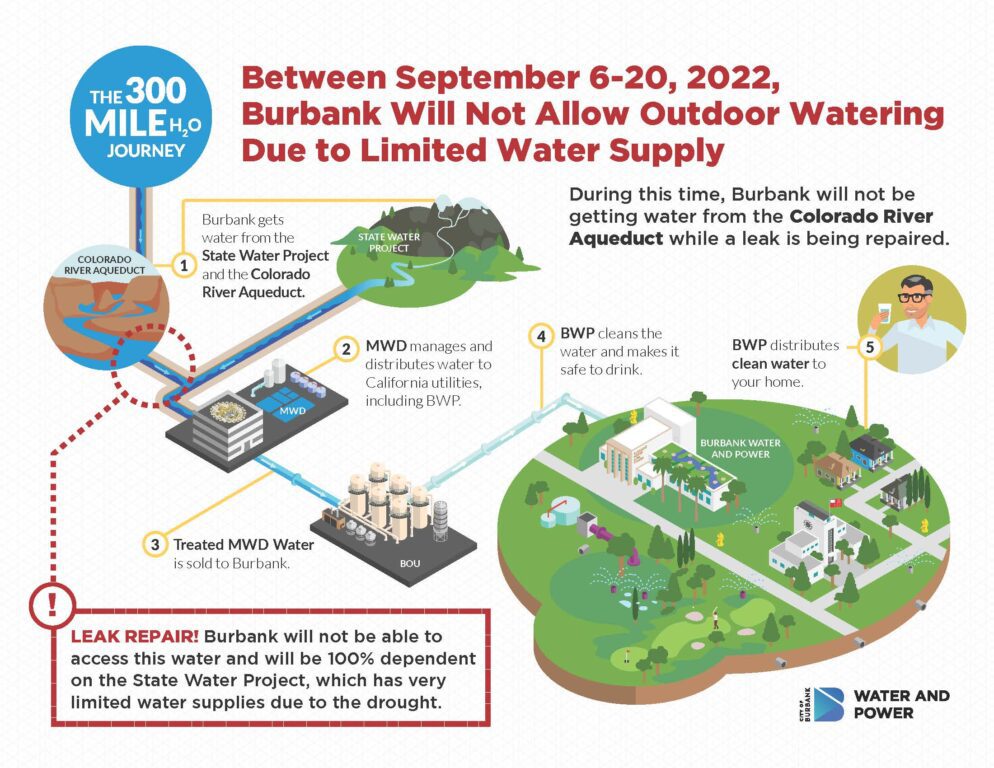 Burbank must temporarily stop all outdoor irrigation for two weeks, from September 6-20, 2022, due to a limited water supply. During this time, the upper feeder that brings water from the Colorado River Aqueduct into the city will be repaired to fix a leak, and Burbank will not have access to this water source. Residents and businesses must adjust their sprinklers and automated irrigation systems so they do not run during this period. Hand watering will be allowed during the two-week period.