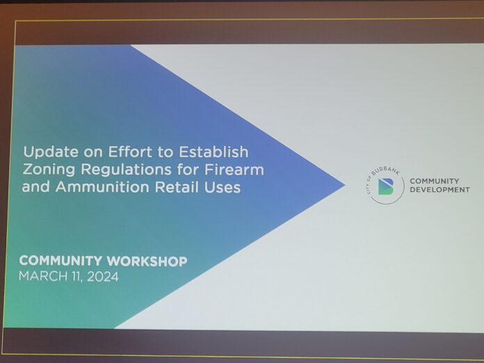 On March 11, 2024 there was a public meeting at the Burbank Community Services Bldg. of the Burbank Community Development staff, which was held from 6 pm to 7:30 pm to report on the July 26, 2022 Burbank City Council directive to its staff to evaluate new regulations for its 14 licensed firearm dealers.