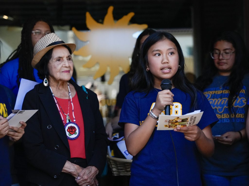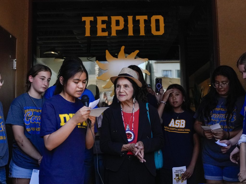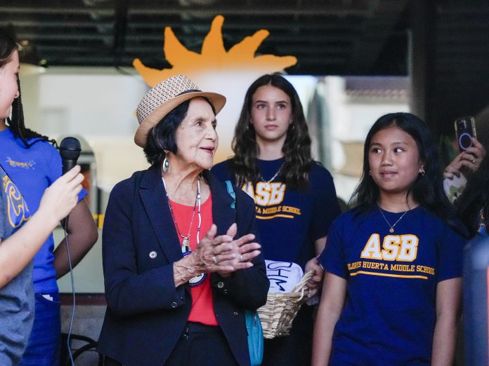 7th-grade students from Huerta Middle School in Burbank, stood next to the now 95-year-old icon and shared how her story continues to fuel their own dreams of making a difference and how it has created change in their own lives. Their words served as a living tribute to Huerta’s mission to educate, uplift, and inspire generations to speak truth to power.