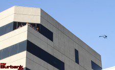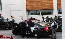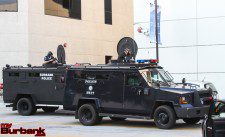 Burbank’s crisis negotiators attempted to talk the suspect out of the car, that was now being blocked in by a patrol car and two armored vehicles. When their attempts failed, Burbank’s SWAT Team and Mental Evaluations Team responded to the scene and again attempted to get the alleged car thief suspect to exit the car.