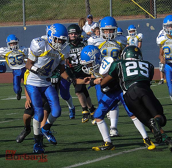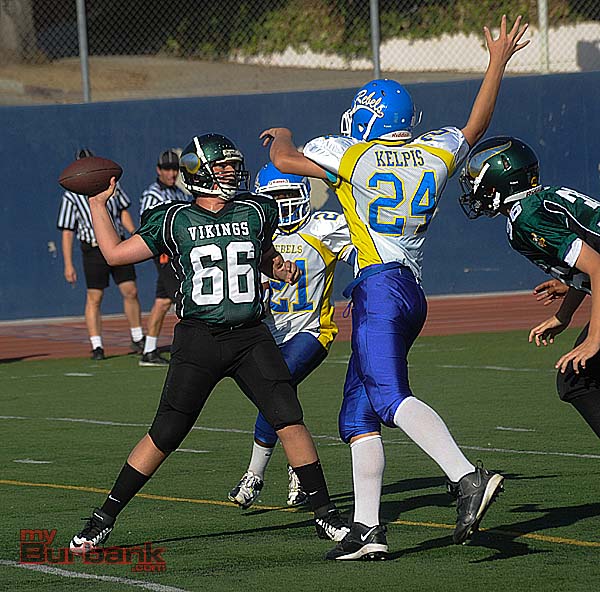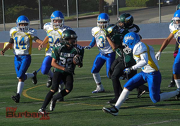 Sixty points filled the scoreboard when the Burbank Vikings Midget Green faced the West Valley Rebels, and the scoring commenced early for the Vikings who claimed a 36-24 decision.