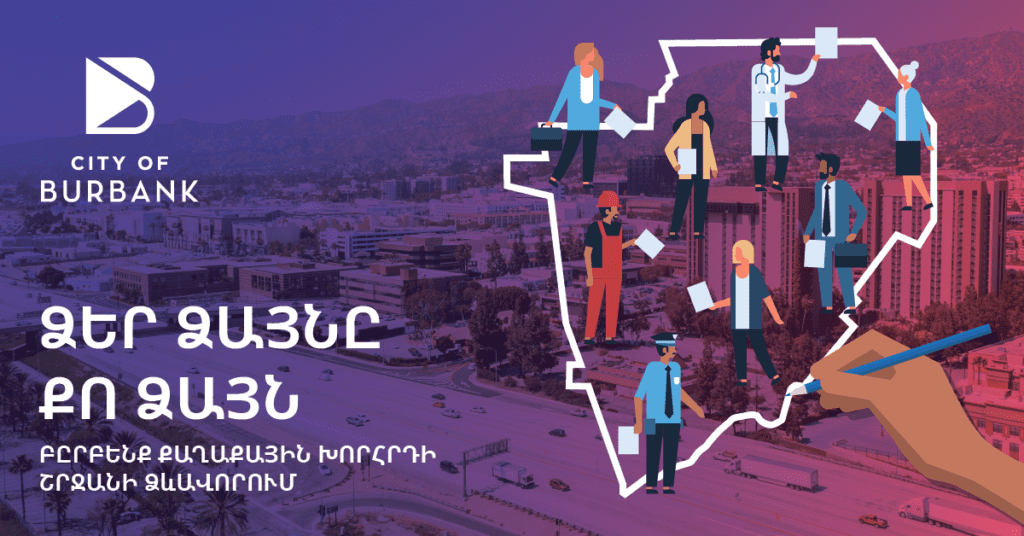 ենք ունենք երկու քարտեզագրման գործիք՝ սահմանների վերաբերյալ ձեր տեսլականը հավաքելու համար՝ Օնլայն թաղամասի գծագրման գործիք՝ DRA 2020 և Draw Your Neighborhood: Թաղամասերի գծագրման գործիքը համայնքների անդամներին հրավիրում է առաջարկել Քաղաքային խորհրդի առաջարկվող թաղամասերի սահմանները: «Նկարիր քո հարևանությունը» գործիքը համայնքի անդամներին հրավիրում է բացահայտել հետաքրքրություն ներկայացնող համայնքները, որոնք կիսում են մշակույթները, լեզուներ, պատմությունները և հետաքրքրությունները: Լրացուցիչ մանրամասների համար այցելեք՝ BurbankCouncilDistricting.com: