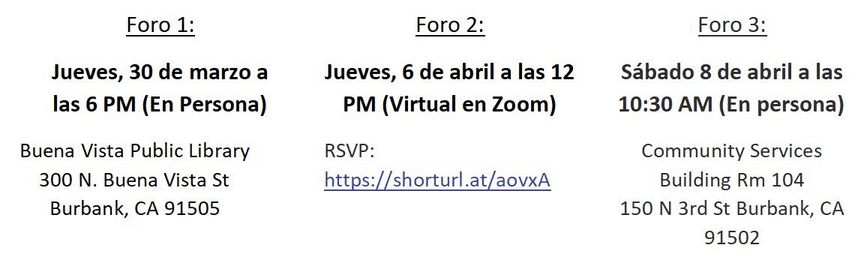 Para obtener más información, visite BurbankCouncilDistricting.com. Para preguntas generales sobre el proyecto, envíenos un correo electrónico a: info@BurbankCouncilDistricting.com. Para suscribirse a nuestra lista de correo, inscríbase en: https://sur-vey.typeform.com/to/yq0sJSYM.