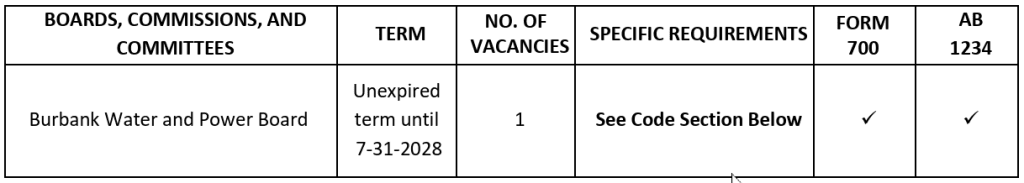 The Burbank City Clerk’s Office is accepting applications for the Burbank Water and Power Board beginning August 13, 2025 through September 12, 2025. Applications may be submitted online by visiting www.burbankca.gov/bccapplication or you can pick up an application in the City Clerk’s Office located in City Hall at 275 East Olive Avenue, First Floor. Completed applications may be submitted online, mailed, or dropped off (no postmarks and no exceptions for late submittals).