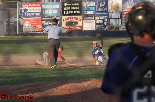 Burroughs’ Tanner Whitlock slides in safely for a double ahead of the tag by Ky Tanner of Burbank (Photo by © Ross A. Benson)