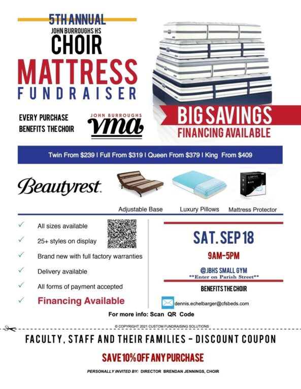 The Mattress Sale Fundraiser runs from 9:00 a.m. to 5:00 p.m. at the adjacent Small Gym on campus. Touted as a “no pressure sale,” the event helps support the wide-ranging efforts of the JBHS choir with their performances, competitions, enrichment opportunities and more.