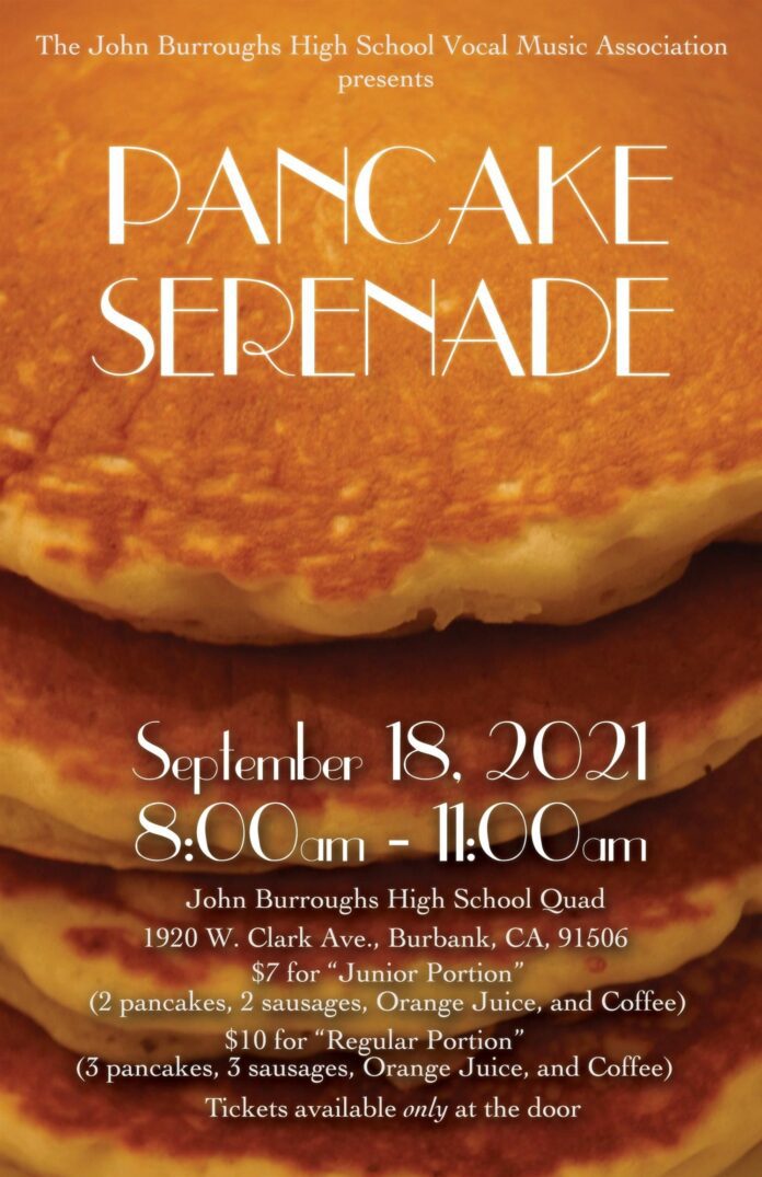 The John Burroughs High School Vocal Music Association hosts its annual Pancake Serenade and Mattress Sale Fundraiser on Saturday, September 18, from 8:00 a.m. to 5:00 p.m. on the high school campus.