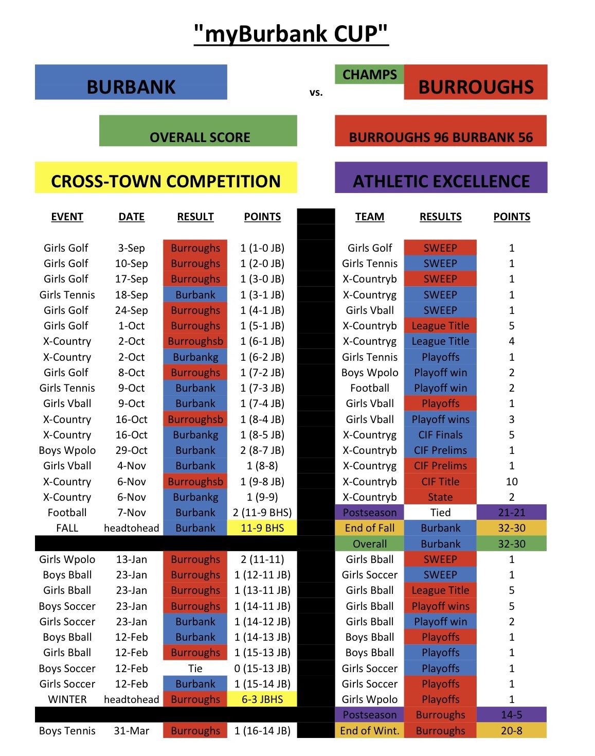 The winner between Burbank and Burroughs was determined by the accumulation of points based on head-to-head varsity competition and athletic achievement (league titles, playoff success, bonus points for season sweeps against each other) during the school year. This pertains only to team competition and not individual achievement.