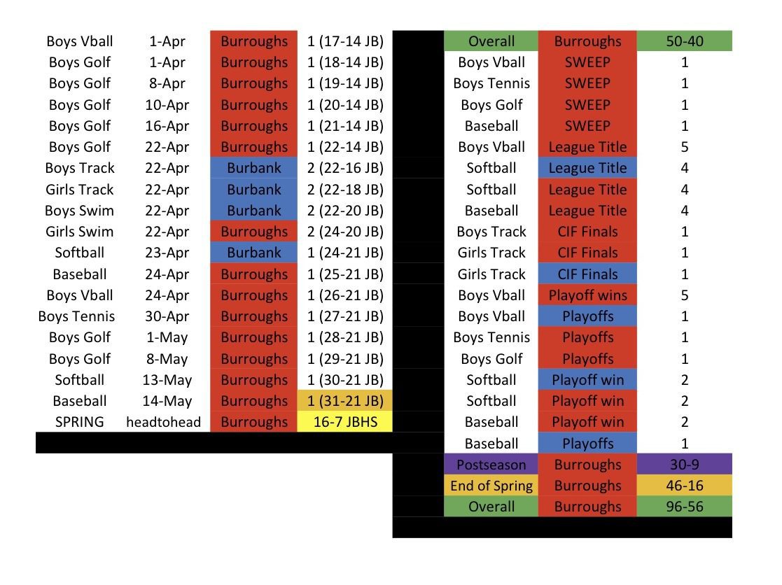 Burroughs took the spring by a total of 46-16 which resulted in a convincing 96-56 win in cumulative points to take ownership of the second annual “myBurbank CUP.”