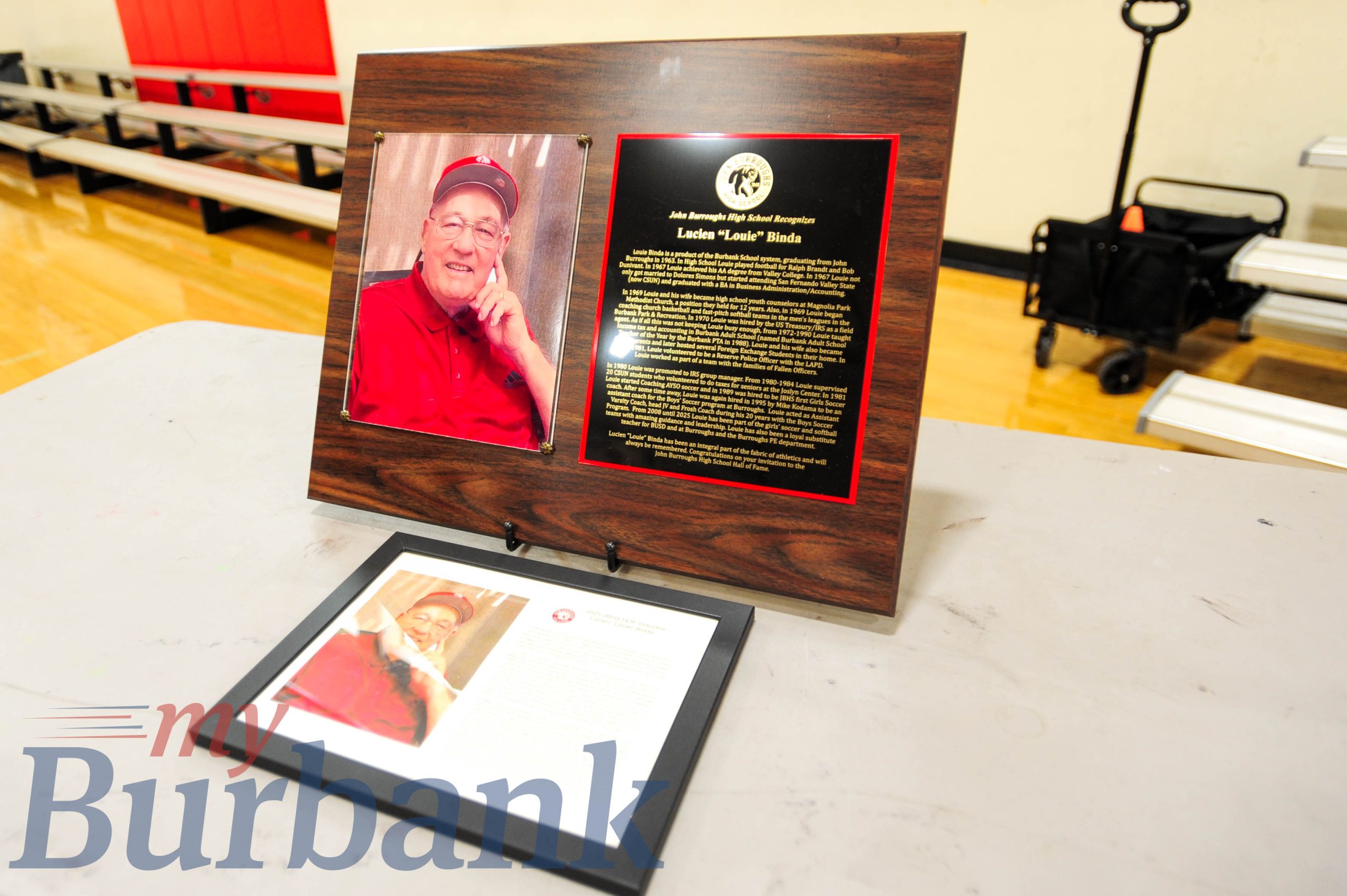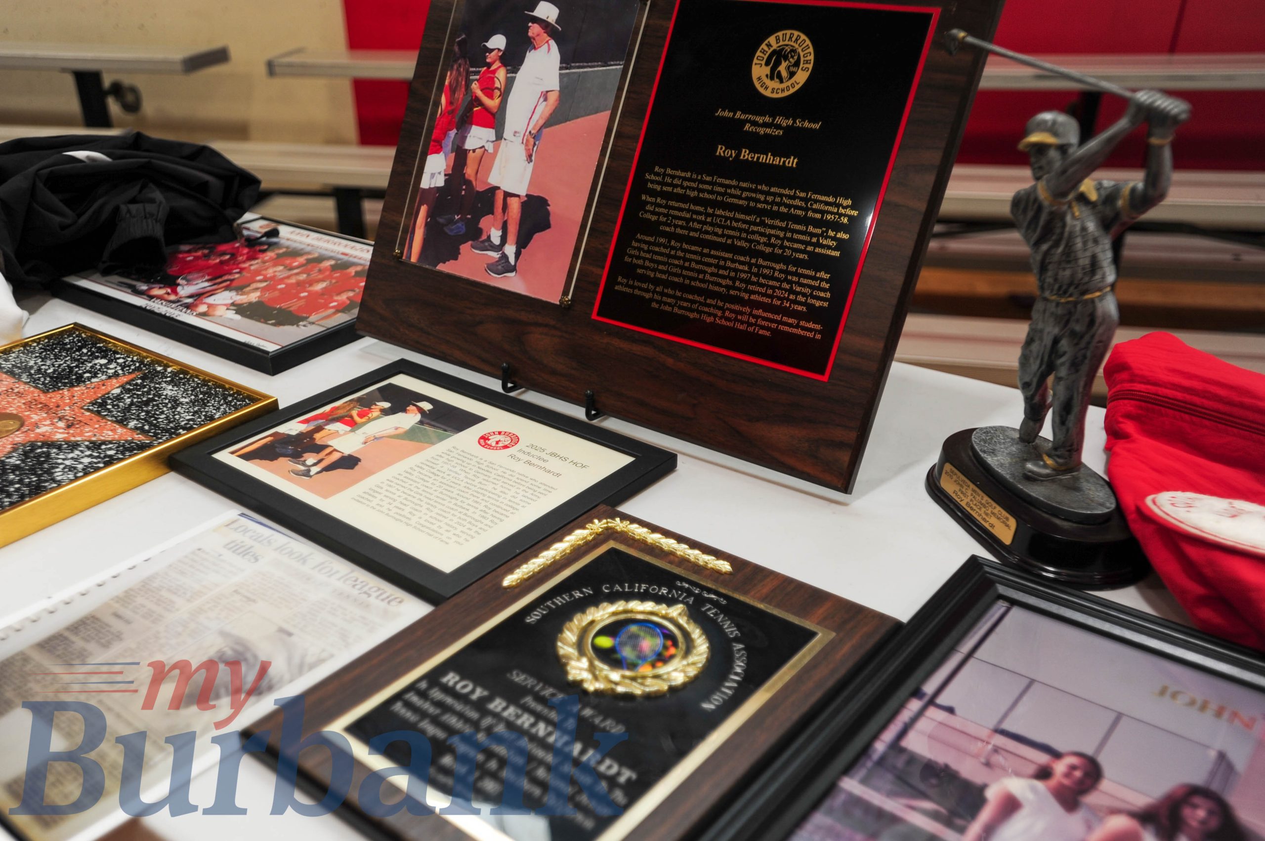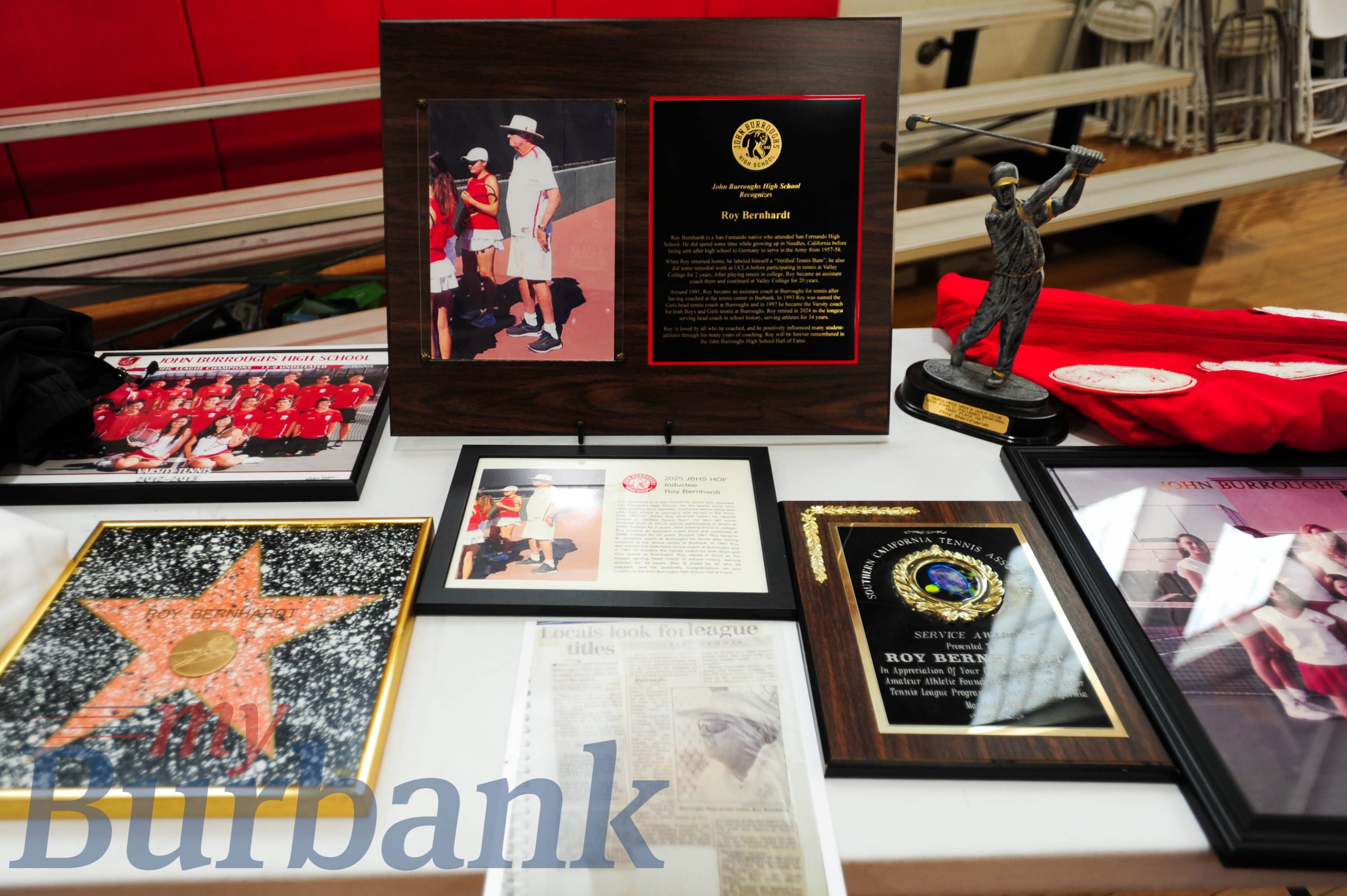 Longtime tennis coach Roy Bernhardt and Louie Binda, who coached soccer and softball for several decades were given their plaques and recognized for their service to Burroughs.