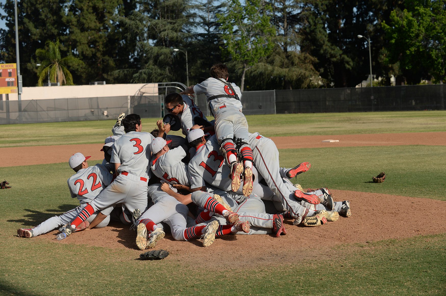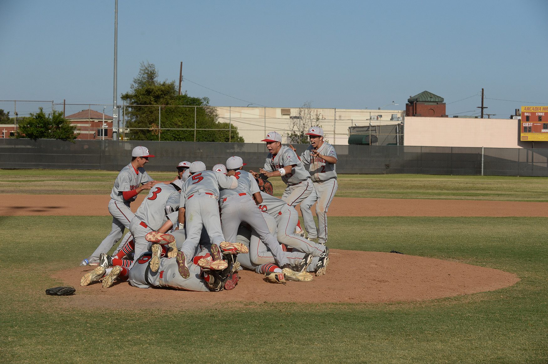 Danny Bustos fired a complete game four-hit shutout, the team’s ninth skunking this year, Ryan Galan (3 for 4 with a double and two runs scored) and Max DeAmicis (two RBIs) ignited the offense, and Burroughs blanked Arcadia 4-0 to celebrate as league champions with a well-deserved dogpile on the mound.