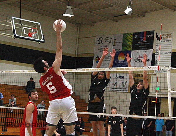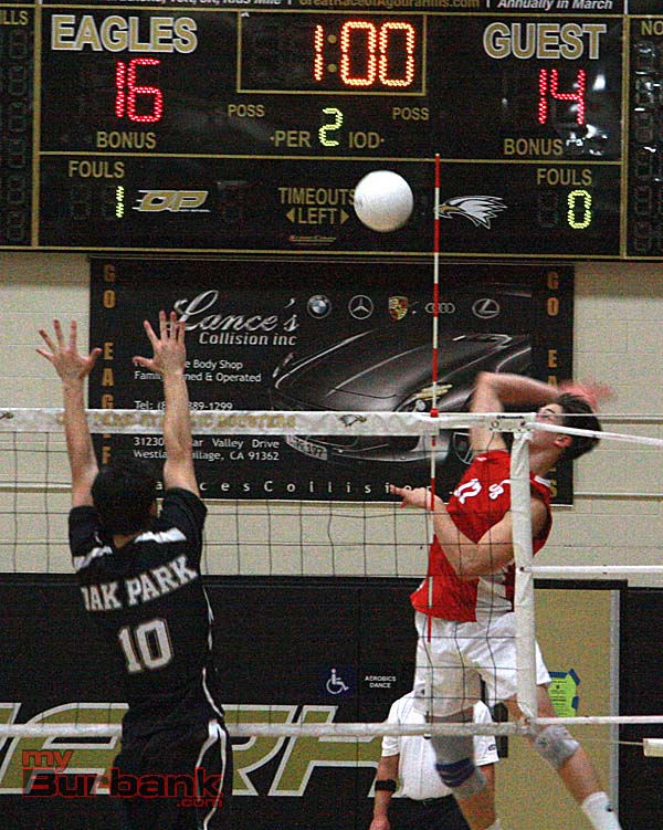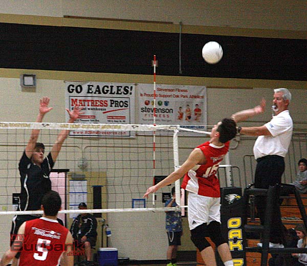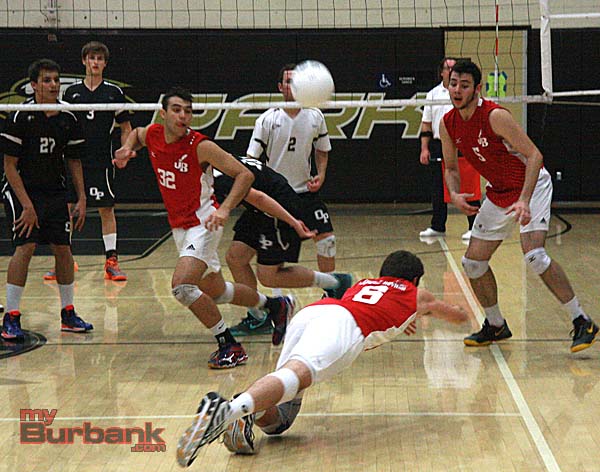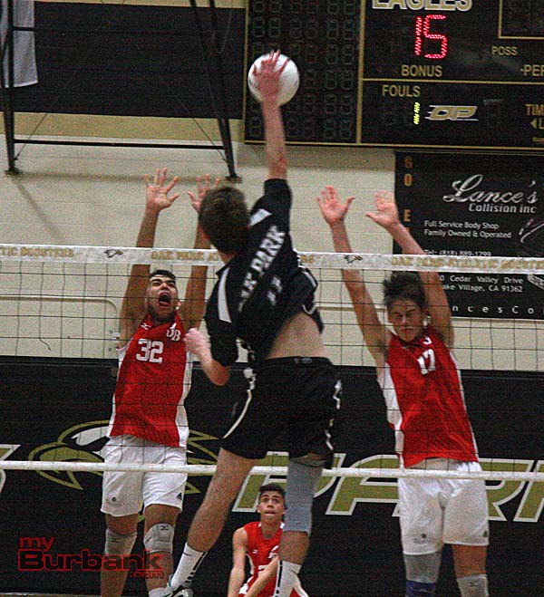 Behind an enthusiastic crowd that included a boisterous junior varsity team and a tough-minded group of talented volleyball players, the Burroughs Indians came away with a hard-fought 3-2 win on the road against Oak Park (17-25, 21-25, 25-23, 25-23, 15-9) despite trailing 2-0.