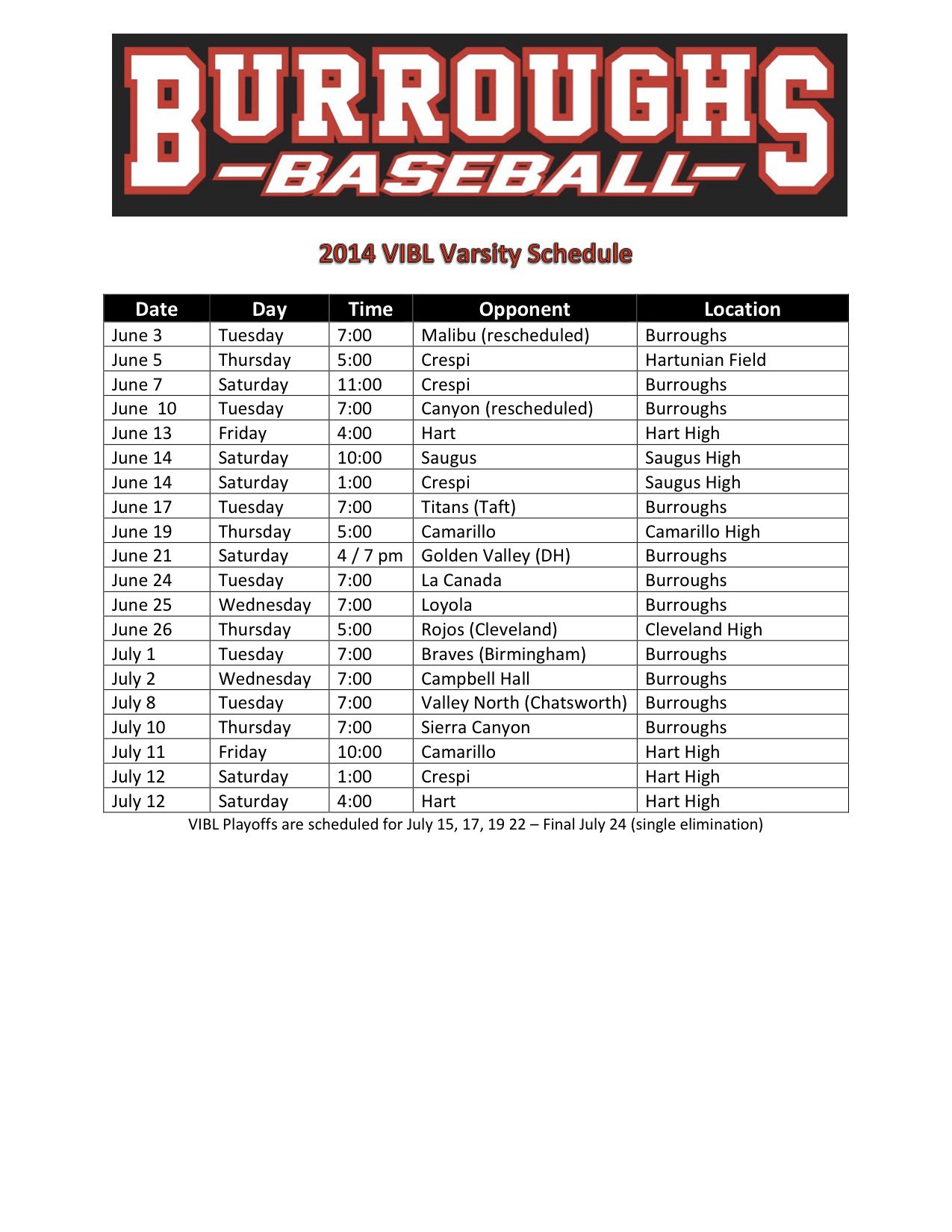 Below are the websites for each program. Please note that the game schedules are subject to change at any time. Burroughs will traditionally play at 7 p.m. at home and 5 p.m. on the road and Burbank will go at 6 p.m. at home and 5 p.m. on the road during weeknights. Weekend game times vary for each school.