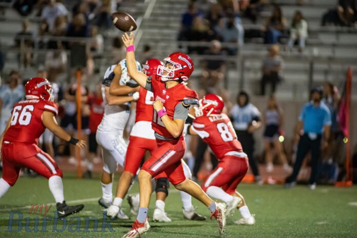 On a clear and pleasant evening at Memorial Field, the Burroughs High football team scored four times through the air and knocked off Crescenta Valley 28-7 on Friday on Senior Night and with the victory earned a share of the Pacific League title for the first time since 2015.