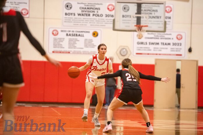 High pressure defense by Burroughs forced numerous turnovers by the Apaches and many of the miscues were converted into points by the Bears who scored several easy hoops.