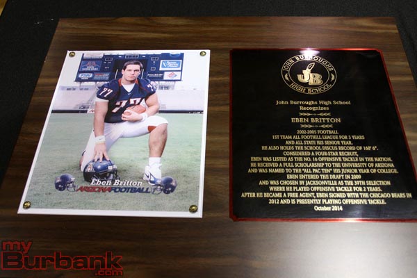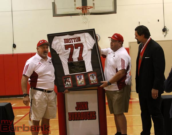 Britton had his No. 77 Burroughs jersey officially retired at the ceremony. He was a three-year varsity starter at JBHS earning All-State, All-CIF and All-Foothill League honors. Considered a four-star recruit by Rivals.com, Britton earned a scholarship to the University of Arizona where he was named first-team All-Pac 10 in 2008.