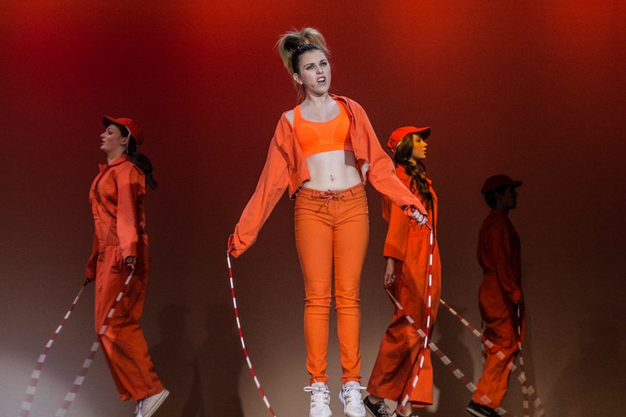 Senior Samantha Rubin and juniors Winston Browne and Liliana Schoenke entertain the crowd throughout the performance, and at intermission, as Elle’s personal Delta Nu Greek Chorus.