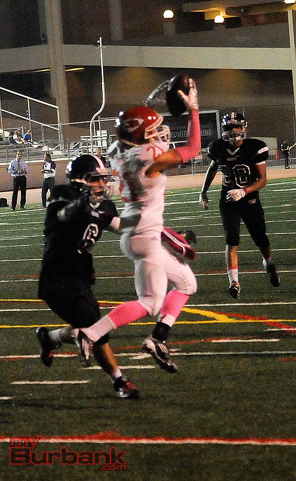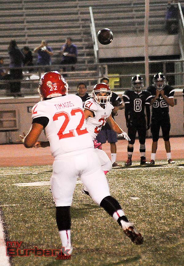 Quarterback Aieson Timagos completed five of seven passes for 55 yards, one touchdown and an interception as he filled in admirably for Andy Amela who is recovering from a concussion suffered against Crescenta Valley.