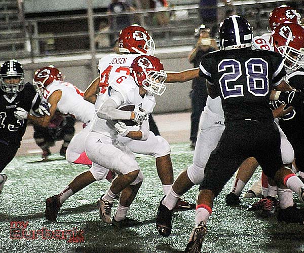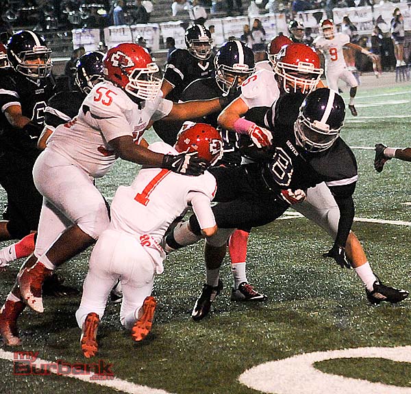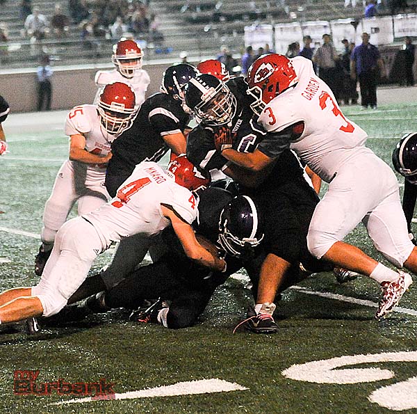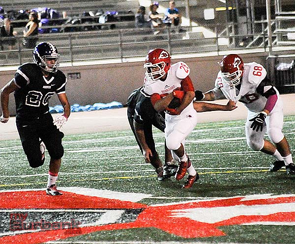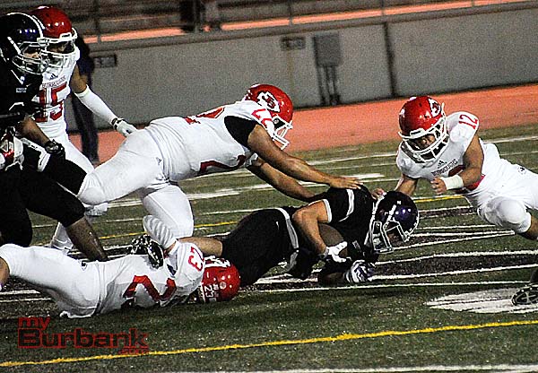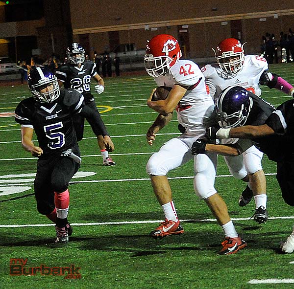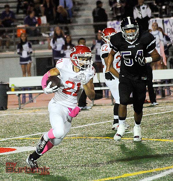 Professor Keith Knoop and his class of Indians came to Glendale Thursday night and delivered a thorough lesson of Football 101 to the host Tornadoes of Hoover High. Behind a rushing attack that accumulated 433 yards of offense and a stingy defense which stifled the opposition and earned the shutout, Burroughs crushed Hoover, 63-0, to claim its first Pacific League win of the year.