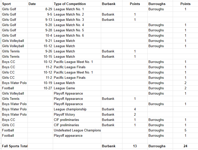 The breakdown of points is as follows:Sport Date Type of Competition Burbank Points Burroughs Points Boys track and field 4/11 League Dual Meet Burbank 2 GIrls track and field 4/11 League Dual Meet Burbank 2 Boys swimmming 4/17 League Dual Meet Burroughs 2 Girls swimming 4/17 League Dual Meet Burroughs 2 Boys Volleyball 3/7 League Match Burroughs 1 Boys Volleyball 4/4 League Match Burroughs 1 Boys volleyball playoff appearance Burroughs 1 Boys volleyball playoff victory Burroughs 1 Softball 4/17 League Game Burbank 1 Softball 4/23 League Tournament Burroughs 1 Softball Playoff Appearance Burbank 1 Softball Playoff Appearance Burroughs 1 Baseball 4/23 League Game Burroughs 1 Baseball 4/26 League Game Burbank 1 Baseball Playoff Appearance Burroughs 1 Baseball Playoff Appearance Burbank 1 Boys Tennis 3/12 League Match Burbank 1 Boys Tennis 4/18 League Match Burbank 1 Boys Tennis Playoff Appearance Burroughs 1 Boys Tennis Playoff Appearance Burbank 1 Boys Tennis Playoff Victory Burbank 1 Boys Golf 2/29 League Match No. 1 Burbank (on tiebreaker) 1 Boys Golf 3/7 League Match No. 2 Burroughs 1 Boys Golf 3/14 League Match No. 3 Burbank 1 Boys Golf 3/28 League Match. No. 4 Burbank 1 Boys Golf 4/11 League Match No. 5 Burroughs 1 Boys Golf 4/23 League Finals Burroughs 1 Boys Golf 4/4 Burbank Cup Burbank 1 Spring Total Burbank 16 Burroughs 16 End of School Year Total Burbank 32 Burroughs 55 Sport Date Type of Competition Burbank Points Burroughs Points Girls Basketball Jan 12 League Burroughs 1 Girls Basketball Feb 1 League Burroughs 1 Girls Basketball Playoff Appearance Burroughs 1 Girls Basketball Feb. 8, 10 Playoff Victories Burroughs 3 Boys Basketball Jan. 12 League Burroughs 1 Boys Basketball Jan. 12 League Burroughs 1 Girls Soccer Jan. 12 League Burroughs 1 Girls soccer Feb. 1 League Burroughs 1 Girls soccer Feb. 6 Playoff appearance Burroughs 1 Boys soccer Jan. 12 League Burroughs 1 Boys soccer Feb. 1 League Burbank 1 Girls water polo Jan. 23 League Burroughs 2 Girls water polo Feb. 6 Playoff appearance Burroughs 1 Winter Total Burbank 1 Burroughs 15 Fall and Winter Combined Burbank 14 Burroughs 39