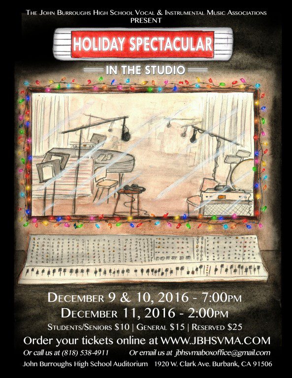 Performances are Friday, December 9th at 7 p.m. and Saturday, December 10th at 7 p.m. and Sunday, December 11th at 2 p.m., all in the John Burroughs Auditorium, 1920 W. Clark Ave., Burbank 91506. General Admission to Holiday Spectacular 2016 is $15 for adults, $10 for students and seniors. Reserved seating is $25. Due to the large amount of students performing, the seating is limited so order your tickets now at http://www.itsmyseat.com/JBHSVMA/ tickets can be purchased at the auditorium box office before the performances. For questions about Holiday Spectacular, please call (818) 538-4911 or email at jbhsvmaboxoffice@gmail.com