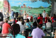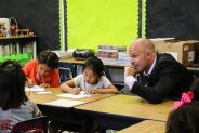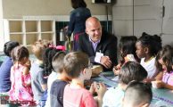 Superintendent Matt Hill joins some second graders during snack time at Providencia Elementary. (© Photo by Ross A. Benson)