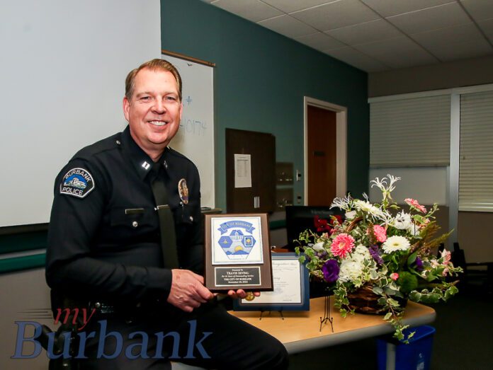 Captain Travis Irving retired from the Burbank Police Department after over 24 years of service to the community earlier this week. He was sent off by Chief Michael Albanese, City Manager Justin Hess, and many of his co-workers during a gathering at Burbank Police Headquarters. Captain Irving’s wife, Krysti, and their adult children were also in attendance.
