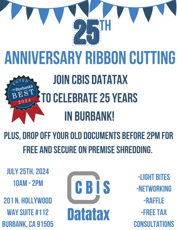 The Burbank Chamber of Commerce will sponsor a ribbon cutting ceremony at CBIS Datatax offices on July 25, 2024 at 10am. The general public is welcome to join in from 10am to 2pm, enjoy some light refreshments, ask tax questions, and drop off their unwanted documents for free on premise shredding.