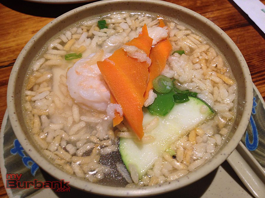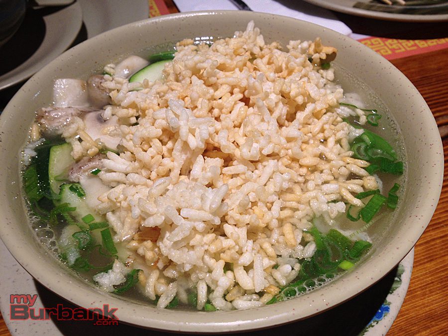 Both the Hot & Sour Soup and the Wonton Soup are delicious, but it is the exciting Three Flavors Sizzling Rice Soup that the family enjoys most. Clear, savory broth is loaded with fresh vegetables like mushroom, carrot, zucchini and snow pea, along with shrimp and chicken pieces.