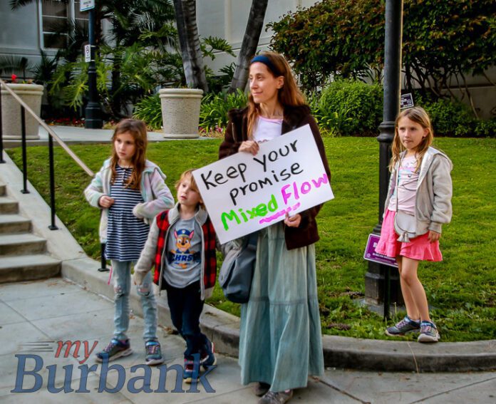 Before the meeting, a protest organized by Vision Burbank in support of the mixed flow solution was met with opposition from others who wanted to see a dedicated bus lane, with members of Burbank’s Transportation Commission leading the other side.