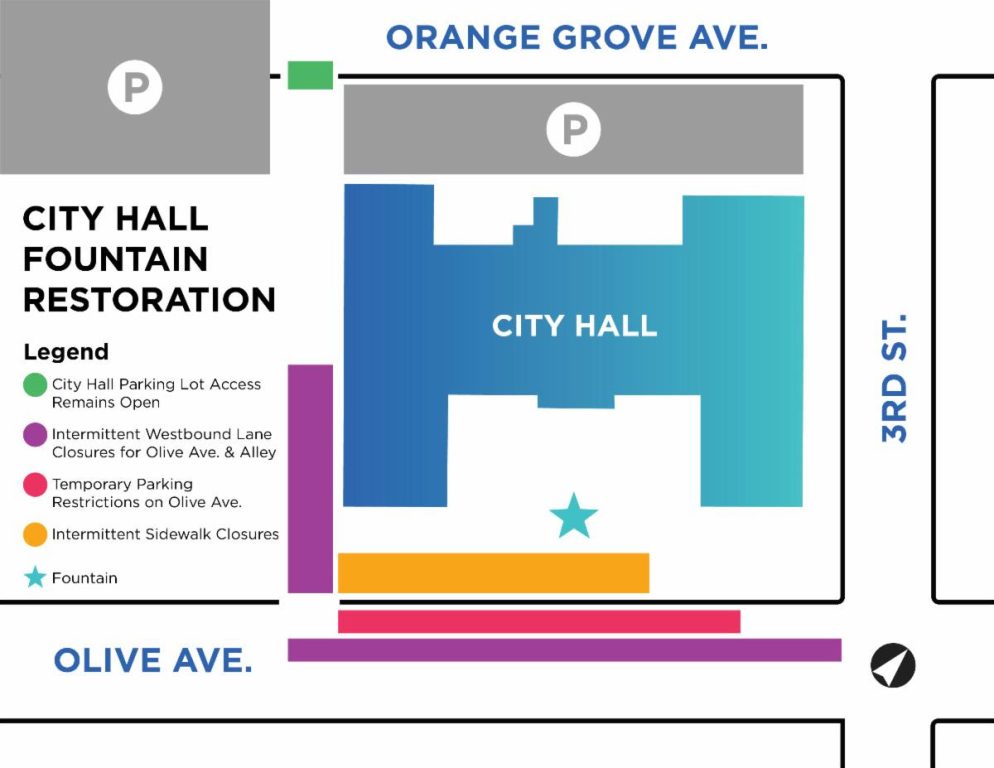 • Parking Restrictions: Parking directly in front of City Hall on Olive Avenue will be temporarily restricted from Third Street to the alley beside City Hall.