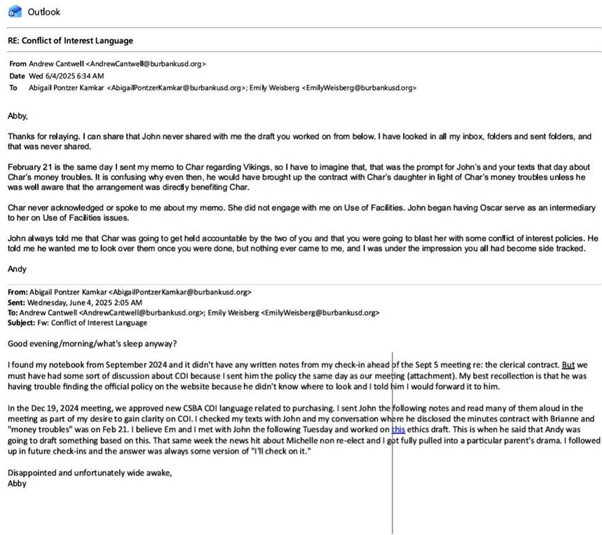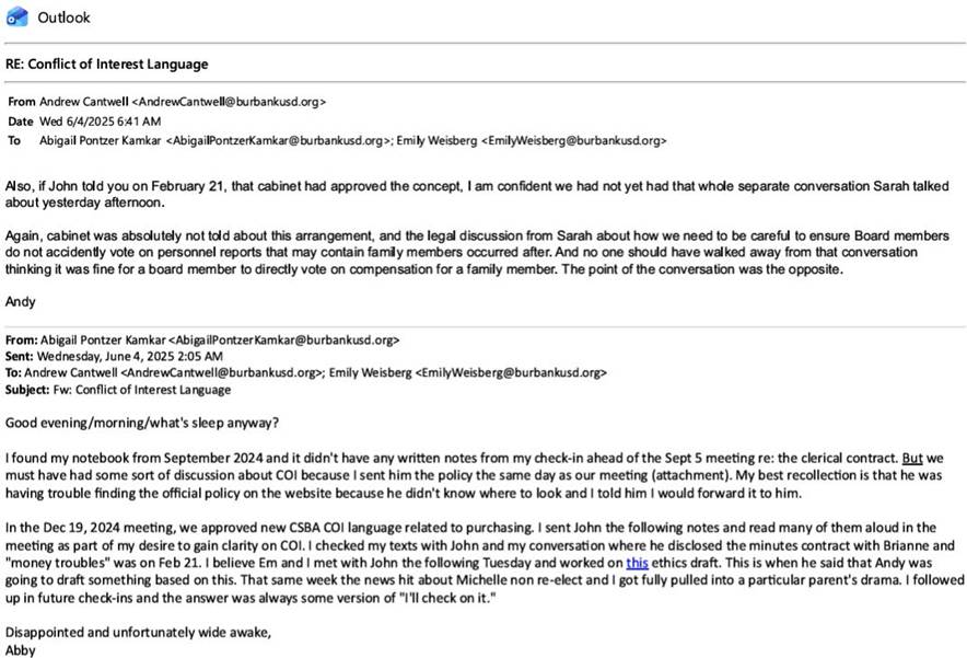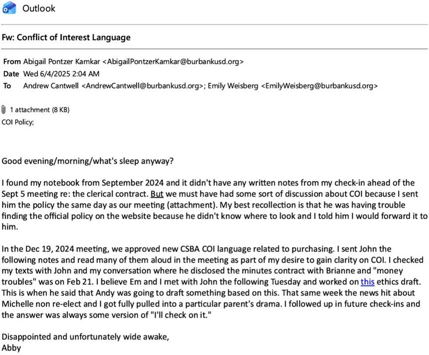 Attached to Pontzer Kamkar’s June 4, 2025 2:05 am email (above), she forwards a December 19, 2024 email in which she discusses the conflict of interest policies with former Superintendent Paramo, indicating that she was aware of the Trustee Tabet conflict of interest at that time, and working on a plan to “blast” Trustee Tabet.