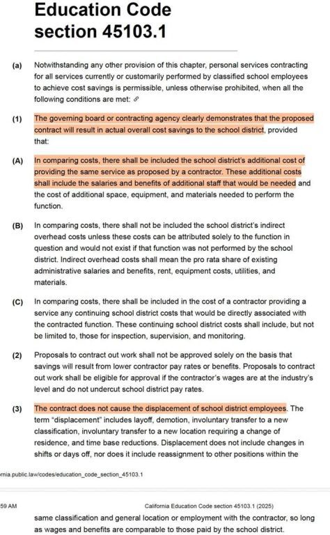 California Education Code section 45103.1 – Sets strict conditions for school districts to contract out services “currently or customarily” performed by classified employees for cost savings, requiring demonstrated overall savings, no displacement of workers, contractor pay at industry levels, and substantial savings justifying the contract.