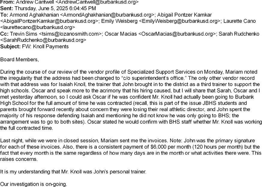 At no time did Pontzer Kamkar ask for a performance review for Mr. Cantwell in consideration of her approval of his promotion and raise, and, according to Mr. Cantwell on December 18, 2025, no performance review was done, despite the many errors and missteps in his area of oversight, several leaving BUSD open to significant liability. These errors have been made public in the statement of charges against Mr. Cantwell at the December 18, 2025 hearing to terminate Mr. Cantwell for cause. Most of the charges were previously brought to the Board during public comment by community members as matters of concerns, and in requests to prevent the promotion and raise for Mr. Cantwell. A summary of the charges can be found in the Burbank Leader article, “Burbank School Official Claims Retaliation for Blowing Whistle,” December 26, 2025, by Jarrett Liotta.