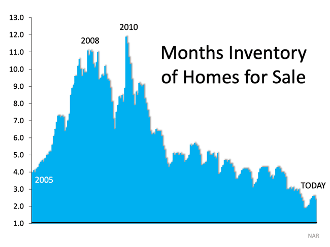 When foreclosures hit the market back in 2008, there was an oversupply of houses for sale. It’s exactly the opposite today. In 2008, there was over a nine-month supply of listings on the market. Today, that number is less than a three-month supply. Here’s a graph showing the difference between the two markets.