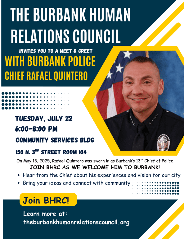 The Burbank Human Relations Council invites the community to a special evening with newly appointed Police Chief Rafael Quintero on Tuesday, July 22, from 6:00 to 8:00 PM at the Community Services Building, located at 150 N. 3rd Street, Room 104, Burbank.