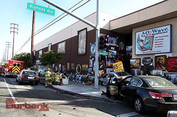 Burbank Police and Firefighters responded to the intersection of Alameda Ave. and Victory Blvd. Friday afternoon following a traffic accident that sent the two cars involved crashing over the curb and onto the sidewalk.