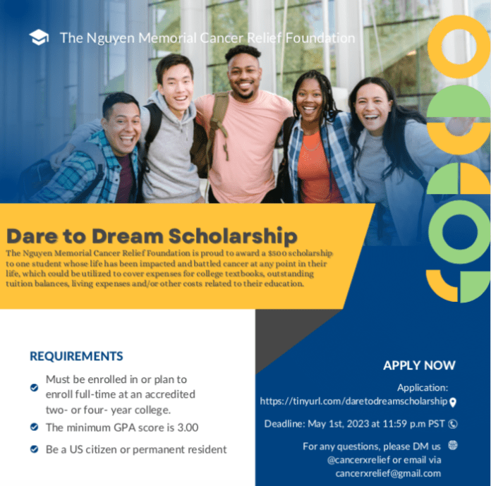 Established in 2020 with the hope of brightening the days of cancer warriors, The Nguyen Memorial Cancer Relief Foundation is proud to award a $500 scholarship to one student whose life has been impacted and battled cancer at any point in their life, which could be utilized to cover expenses for college textbooks, outstanding tuition balances, living expenses and/or other costs related to their education. Our ultimate is to encourage and support the journey of young cancer survivors and patients in chasing their dreams. To apply please fill our the application form: tinyurl.com/daretodreamscholarship