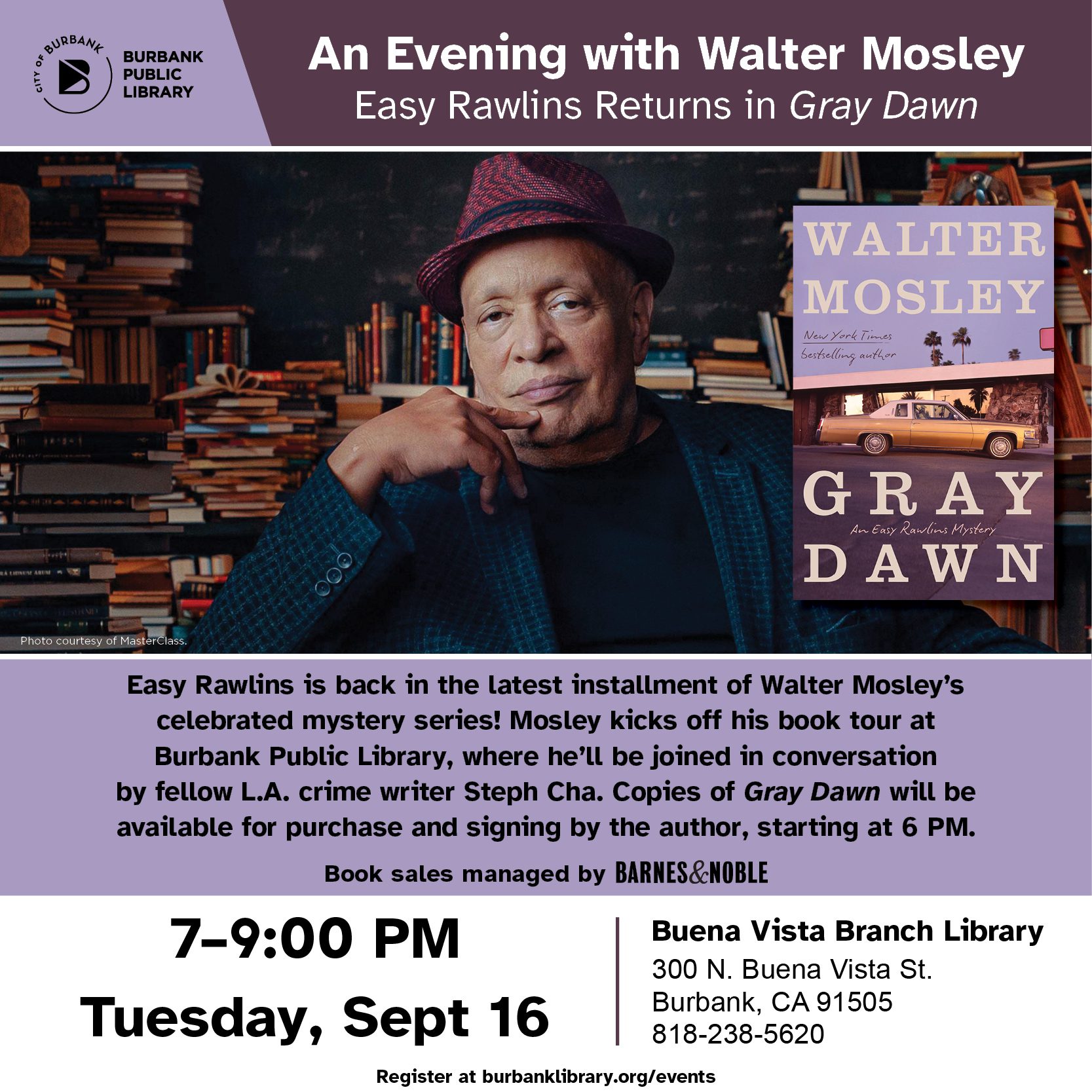 The author of Devil in a Blue Dress, Walter Mosley, celebrates the release of his latest Easy Rawlins thriller Gray Dawn with a special event at the Buena Vista Branch of the Burbank Public Library on Tuesday, September 16.