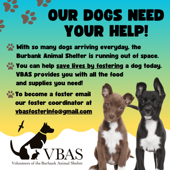 The Burbank Animal Shelter is running out of kennel space for our dogs. You can help save lives by fostering a dog. We will match dogs that fit your lifestyle, and we provide all the food and supplies you will need. Even if you can only foster for a few weeks, it will save lives.