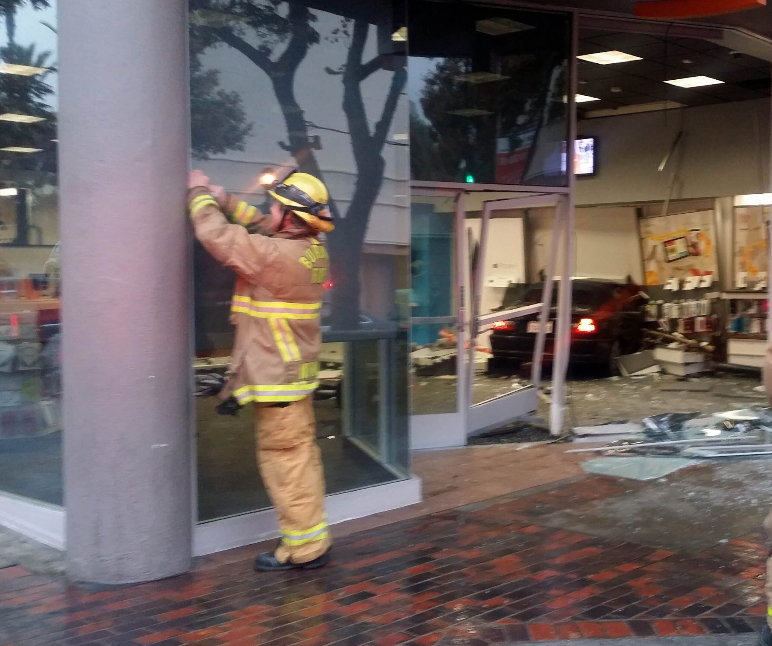 Around 7:10 a.m. a male driver in his mid teens went driving into the AT&T Phone store at the corner of Magnolia and San Fernando Blvd. He was traveling at such a high rate of speed he went directly through the phone store hitting a adjoining wall with the Coffee Bean next door.