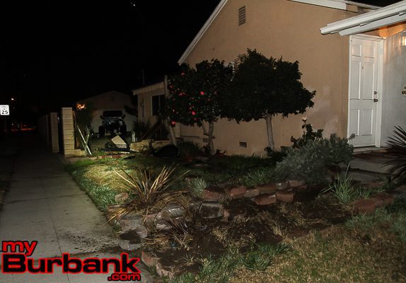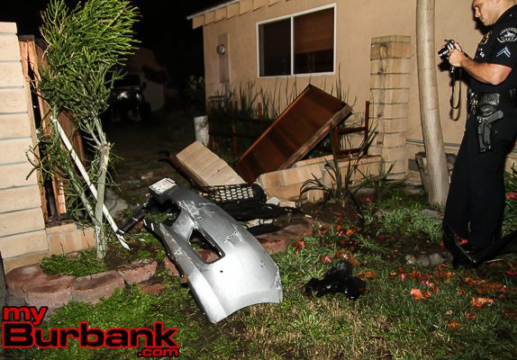 Police were called near the intersection of Van Owen and Buena Vista Tuesday night around 10:45 p.m. for a reported traffic accident with injuries and a vehicle into a structure. Upon arrival, they found one car was struck and sitting in the middle of the street with the second vehicle fleeing the scene. The suspect’s vehicle lost its front bumper and license plate a block from the scene after driving up over the curb and striking a brick wall.