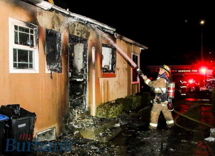 Burbank Fire Fighters responded to the 2500 Block of Brighton Street on Friday morning at 12:28 am to find a triplex with the front unit showing fire inside. The first engine on scene went directly into fire attack while the truck company went to the roof to ventilate the roof.