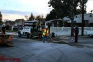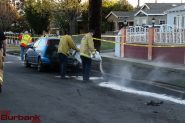 Burbank Public Works was called out to assist with the cleanup of the absorbent and sand used to dike the combination of oil and gas that remained along the curb line. Once all the cars were towed away a Burbank City Street Sweeper made several passes to help clean up any left residue.