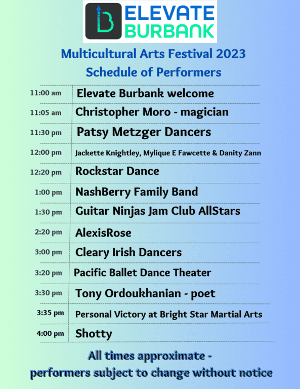 A schedule of performances can be found below and more info on those participating in the festival can be found on the Elevate Burbank website. Some of the vendors joining the fun include Nothing Bundt Cakes, Bliss Box, Local As Can Bee, Mission2Math, Moonstone Craft, Martial Arts for All, Gain Credit Union, Christopher Rizzotti, Robyn Rhodes Jewelry, and Marie Legare Photography.