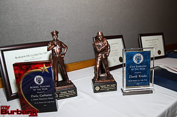Burbank’s Teacher of the Year Darla Gerharter, Firefighter of the Year Eric Jueden, City Employee of the Year David Kriske and Police Officer of the Year Tim Dyrness were all honored by the Burbank Elks Lodge #1497 on Wednesday, January 28.