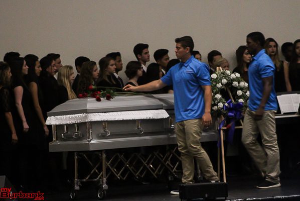 Editor’s Note: The Every 15 Minutes presentation was made at Burbank High School last week which is intended for high school students to see the dangers of drinking and driving – especially at prom time. We asked Janae McGee, an Editor at the Burbank Bulldog, to cover the event for us. myBurbank Photographer, Edward Tovmassian, who is also a Burbank High Senior, shot pictures along with myBurbank’s Chief Photographer, Ross A. Benson. Benson has covered many of these real life tragic events over the years.