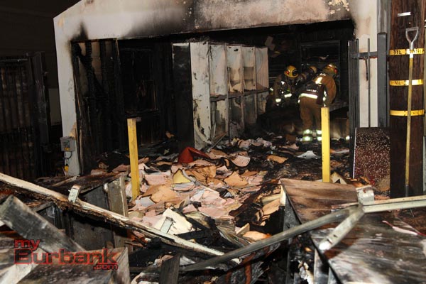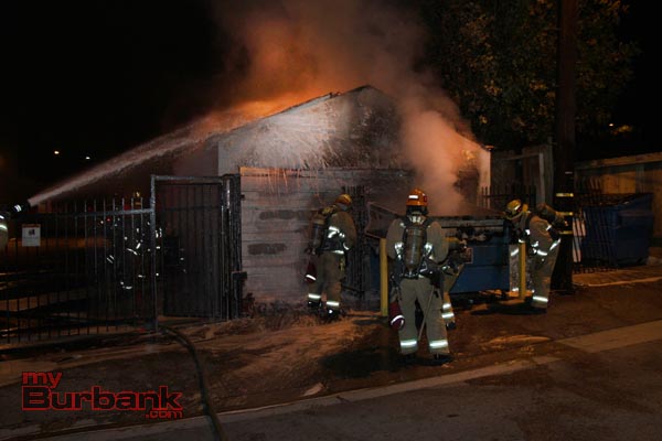 Burbank Firefighters were called again to a reported unknown fire on Saturday night behind the business of the 300 block of East Magnolia near Glenoaks Blvd. When responding firefighters arrived on scene to find a trash dumpster that was next to a detached garage with the dumpster and garage engulfed in flames.